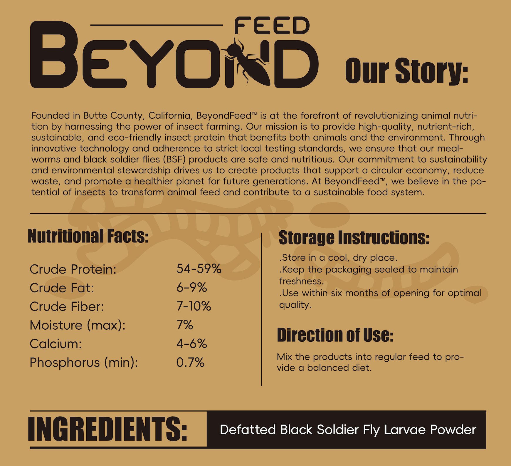 Mejore la nutrición de su animal con BeyondFeed™ Defatted Black Soldier Fly Powder. Este suplemento alimenticio rico en proteínas y nutrientes es perfecto para aves de corral, peces y mascotas. Favorece un crecimiento fuerte y una buena salud general.