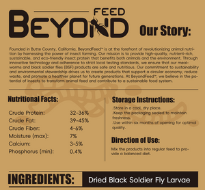 Las larvas de mosca soldado negra seca BeyondFeed™ son una solución de alimentación sostenible y rica en proteínas, perfecta para aves de corral, peces y reptiles. Ricas en calcio y fósforo, estas larvas promueven huesos fuertes y un crecimiento saludable. Producidas en una instalación registrada por la FDA y certificada por GMP+, ofrecen una opción de alimentación natural y ecológica.